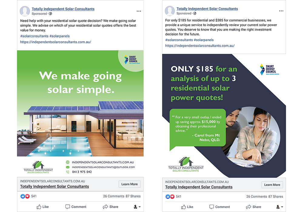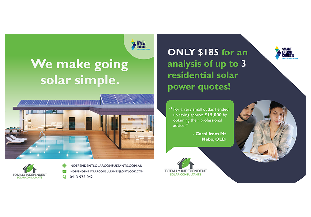 A freelance project to design Facebook social media posts for the client Totally Independent Solar Consultants. The posts would use provided imagery and information to use to come up with copy for the posts. Using the provided imagery and inspiration for copy, I came up with two Facebook posts for the client. I create one Facebook post that focused on a simple tagline for the business along with contact information. The other post focused on promoting the services provided by the business with a partial testimonial in order to make it more appealing to potential customers. After the posts were posted onto the business's page there was an 'immediate impact to [the] business' (James Bailey, owner of Totally Independent Solar Panels).